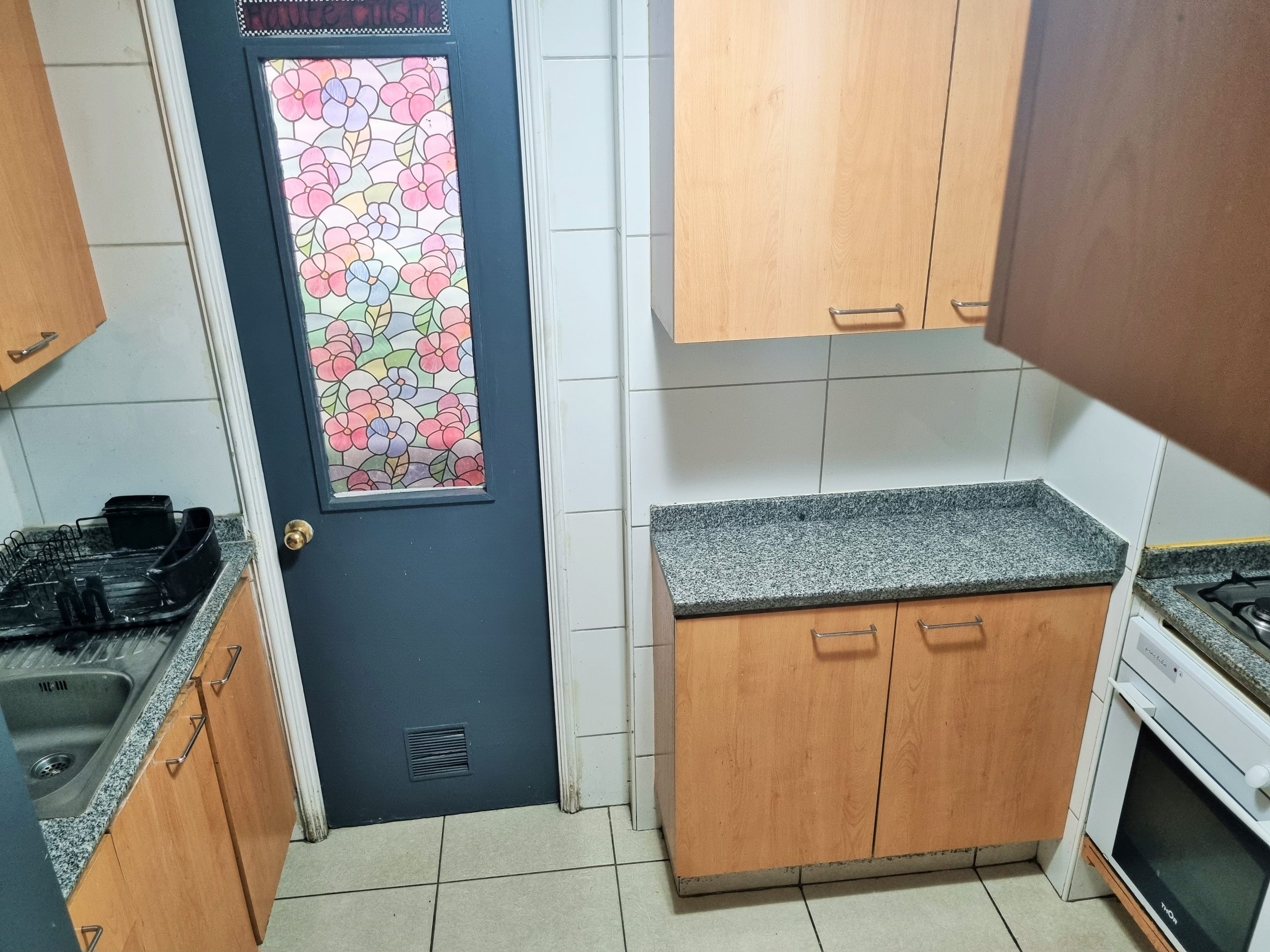 cocina amoblada con cocina encimera y horno empotrado